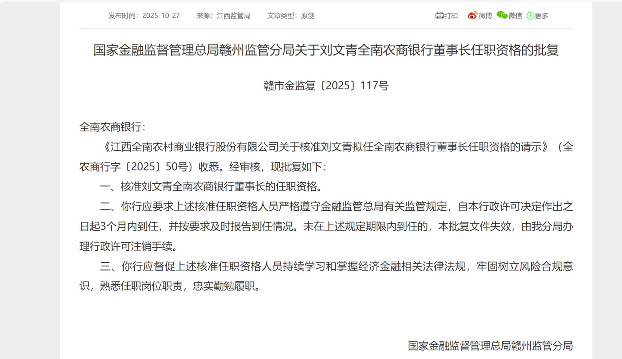 10月27日,国家金融监督管理总局赣州监管分局发布关于刘文青全南农商银行董事长任职资格的批复京海配资,核准刘文青全南农商银行董事长的任职资格。
